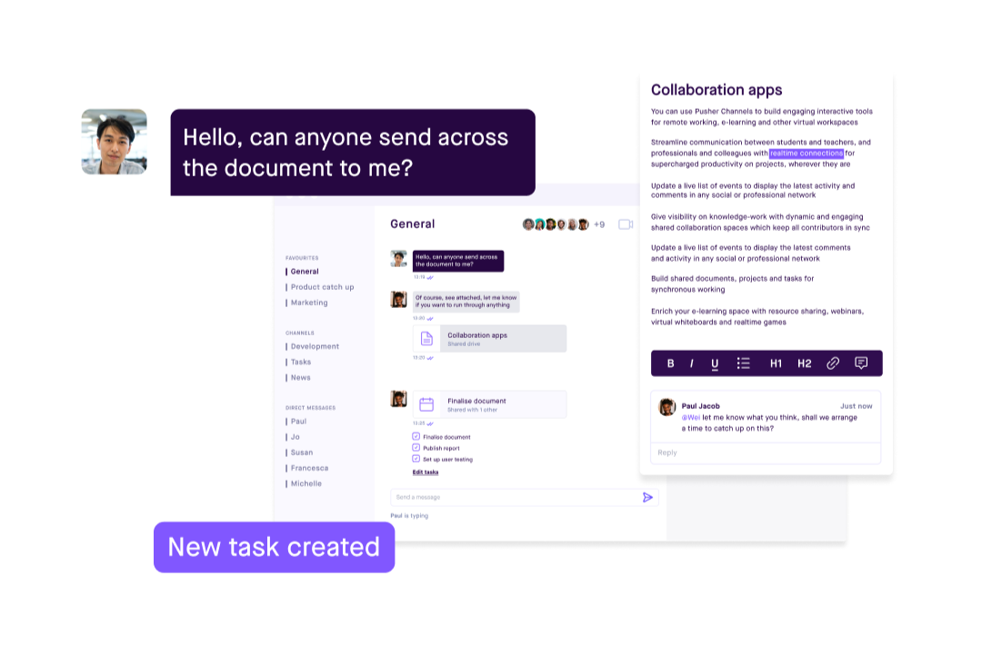 You can be up and running with Pusher in minutes. Managed APIs combined with SDKs that integrate seamlessly mean you will build the features you need, fast, and focus on shipping value.